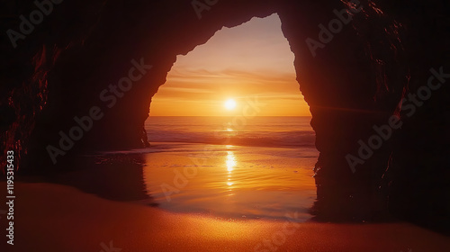 A beach sunset viewed through a cave opening with the sun casting reflections on the wet sand.