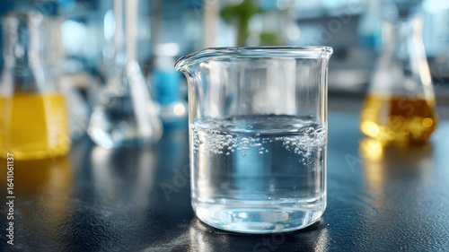 A beaker with liquid on a lab table, blurred background.