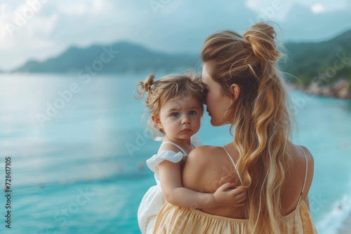 A beaming mother cradles her precious toddler in the warmth of the summer sun, surrounded by the serene beauty of a mountain lake, both wrapped in love and joy on their vacation