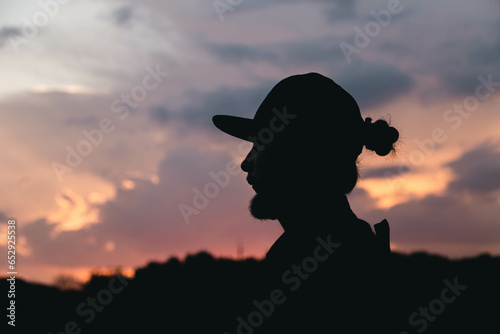 A bearded man with a bun and a cap at sunset on the sky background, a black silhouette of a man.