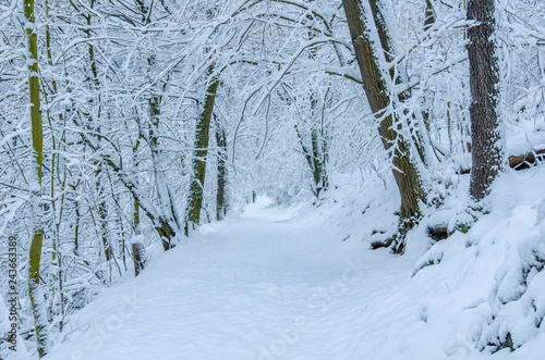 A beautiful alley in the wintery forest after fresh snow in the Harz region of central Germany