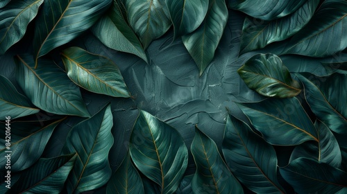 A beautiful arrangement of dark green tropical leaves creating a lush and serene natural background, perfect for eco-friendly themes.