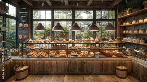 A beautiful bakery shop with freshly baked , offering a wide variety of bread and pastries to choose from.