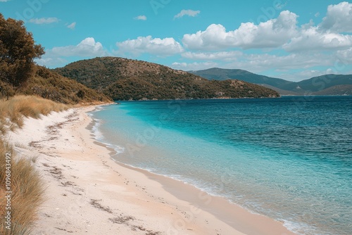 A beautiful beach with a clear blue ocean and a mountain in the background
