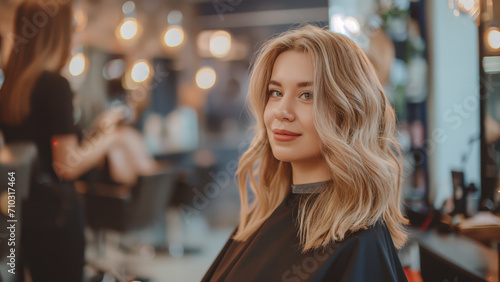 a beautiful blonde model woman in the hairdresser salon gets a new haircut, dyes her hair and style it. sitting on the chair and talks to the hairstylist