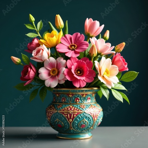 A beautiful bouquet of fresh flowers in a decorative ceramic pot with intricate patterns on the sides, interior design, plants