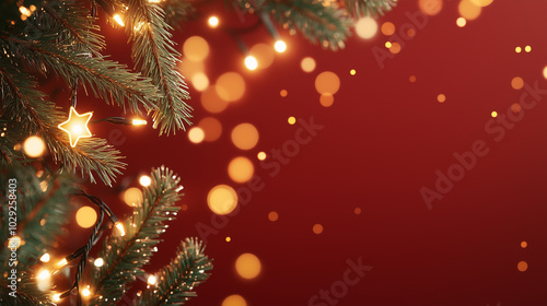 A beautiful Christmas frame with pine tree branches covered in twinkling lights and small glowing stars, creating a festive and warm holiday atmosphere. The deep red background is