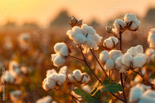 A beautiful close-up of a cotton field at sunset, highlighting the fluffy bolls and warm golden light, with a soft and dreamy background of plants, leaves, and field.