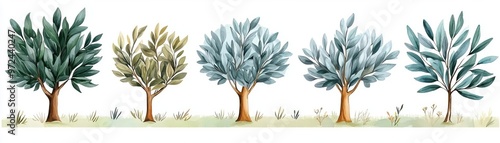 A beautiful illustration of five distinct trees showcasing varying leaf colors and shapes in a picturesque landscape.