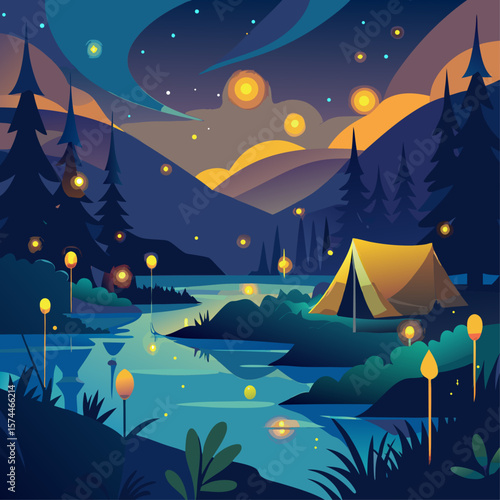 A beautiful landscape with a campground and a tent. The sky is dark and the sun is setting