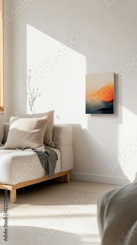 A beautiful living room with minimalist decor in neutral colors. A sophisticated and simple contemporary living room with a painting on the wall.