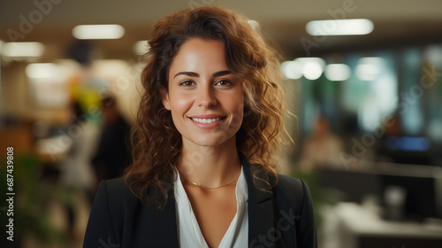 A beautiful professional brunette woman with a smile standing in the office environment
