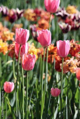A Beautiful Scene Of Bright Pink Tulips Blooming Amidst A Vibrant Array Of Colorful Flowers In A Sunlit Garden, Capturing The Essence Of Springtime Beauty And Renewal...