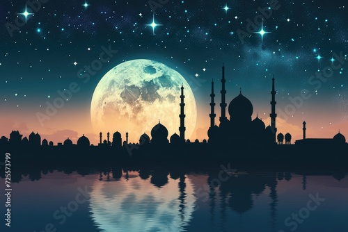 A beautiful silhouette of a mosque and Mesmerizing night view of a mosque under starry sky and bright moon. Perfect for Ramadan, Eid, or Islamic religious themed designs.