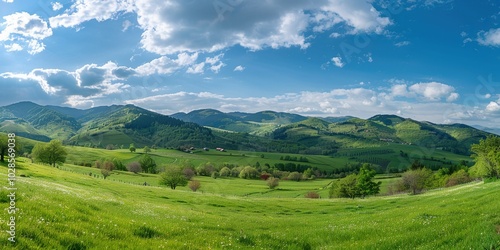 A beautiful summer landscape featuring green fields and majestic mountains under a blue sky, with fluffy clouds scattered above a peaceful valley