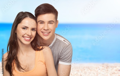 A beautiful tourist couple on a tropical beach and enjoys the view
