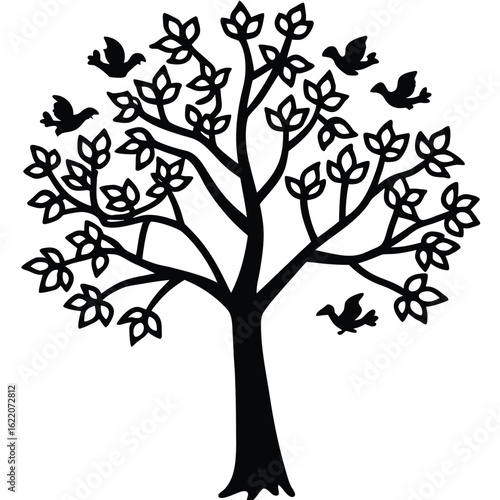 A Beautiful Tree Silhouette with Flying Birds and Leaves