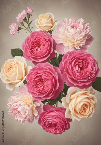 A beautiful vintage-style bouquet of lush pink peonies and soft cream roses against a muted, textured background.