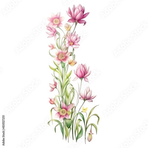 A beautiful watercolor illustration of pink and white flowers with green leaves, perfect for wall art and design projects.