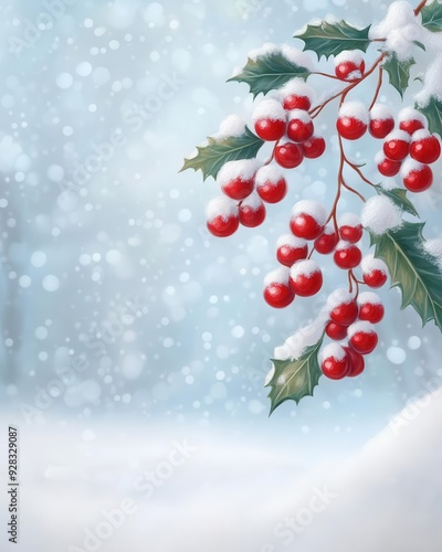 A beautiful winter scene featuring a holly branch adorned with red berries and snow, perfect for holiday-themed designs.
