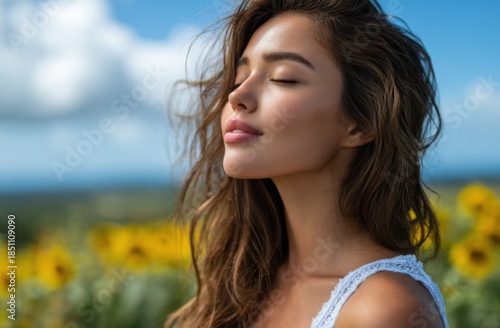 a beautiful woman is breathing in the fresh air of summer, standing amidst sunflowers and blue skies