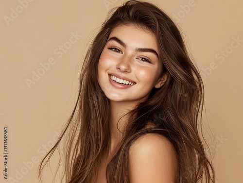 A beautiful woman with long brown hair is posing, showing her shiny and smooth hairstyle against a light beige background for hair care concept.