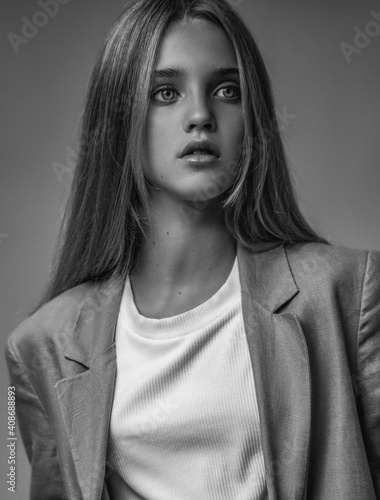A beautiful young girl with blonde hair poses as a fashion model in different images and styles. Added noises and no sharp focus for the author's artistic design.