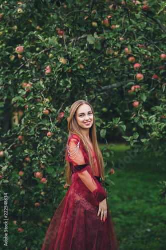 A beautiful young woman in a bard dress is gazing on in the field and the garden.