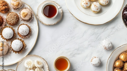 A beautifully arranged display of various desserts and tea on a marble surface.