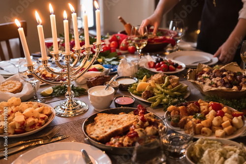 A beautifully arranged table filled with various dishes and candles for a joyful dining experience at night