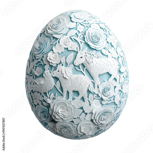 A beautifully carved egg featuring intricate designs of animals and flowers, showcasing artistic craftsmanship and delicate details.isolated on white background