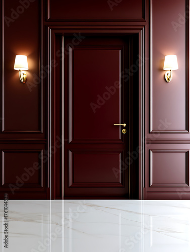 A beautifully crafted, burgundy door with golden handles and matching wall sconces. The polished marble floor reflects the elegance of the entrance, creating a warm and inviting ambiance.