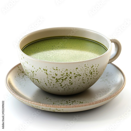 A beautifully crafted ceramic cup filled with vibrant green tea, resting on a matching saucer, exuding a calm and peaceful vibe.