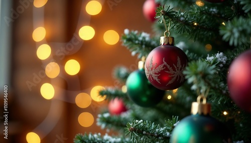 A beautifully decorated Christmas tree adorned with green and red baubles. Warm glowing lights create a festive and cozy holiday atmosphere, perfect for seasonal celebrations and joyful gatherings.