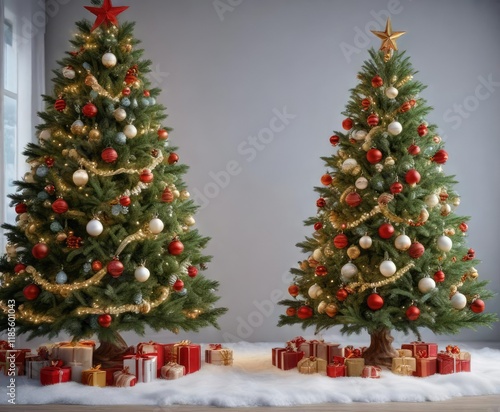 a beautifully decorated Christmas tree with ornaments and garlands against a snowy background, garlands, winter wonderland