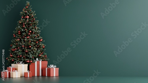 A beautifully decorated Christmas tree with vibrant ornaments stands beside a collection of colorful gift boxes on a green backdrop.