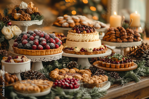 A beautifully decorated holiday table filled with festive desserts and treats for a joyful celebration in a cozy, warm setting