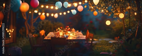 A beautifully decorated outdoor dinner table illuminated by colorful lanterns.