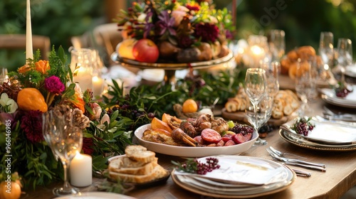 A beautifully decorated party table with an array of delicious dishes, elegant table settings, and festive centerpieces, perfect for a special occasion