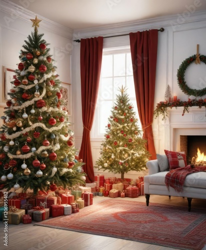 A beautifully decorated room filled with festive ornaments and decorations on a white background, including a festive Christmas tree, decorative vases, Festive room decor