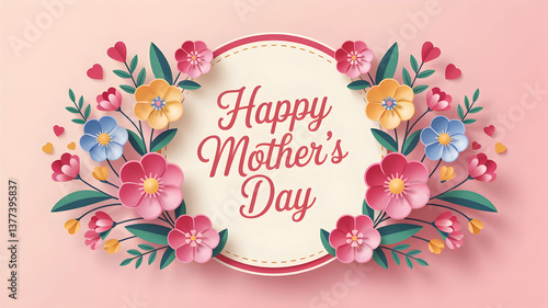 A beautifully designed Mother’s Day greeting card with a floral arrangement surrounding a circular white frame. The text 'Happy Mother's Day' is elegantly written in the center.