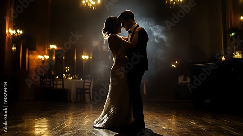 A beautifully illuminated romantic dance between a newlywed couple in an elegant venue, capturing the essence of love and celebration at a wedding.