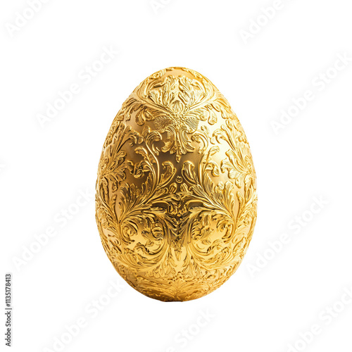 A beautifully ornate golden egg with intricate floral designs, showcasing craftsmanship and luxury isolated on white background