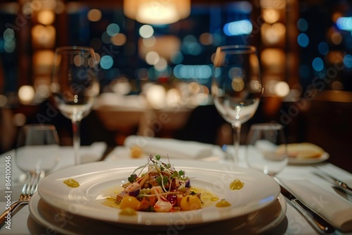 A beautifully plated gourmet dish, with a softly blurred background of a restaurant interior, showing dim lighting, other tables, and patrons dining.