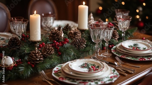 A beautifully set Christmas dinner table with holiday-themed decorations, candles, and a centerpiece of pine cones and holly