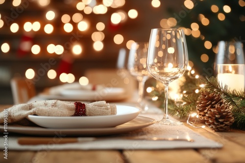 A beautifully set dining table with an elegant wine glass, pinecone decor, and a warm bokeh effect in the background, creating a festive and cozy atmosphere.