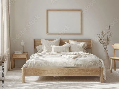 A bedroom with a wooden bed, white pillows, and a white blanket