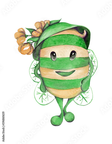 A bee in a hat decorated with fresh flowers. Cartoon character. Isolated watercolor illustration for your design. Ideal for decorating children's things and accessories