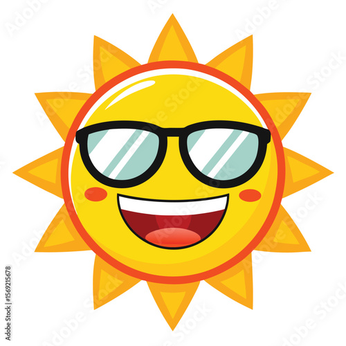 A big smiling sun wearing sunglasses is having a great time, symbolizing a sunny summer day, happiness, and good weather.
