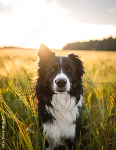 A black and white dog with expressive eyes sits attentively in tall, golden grassy field, bathed in warm sunset light